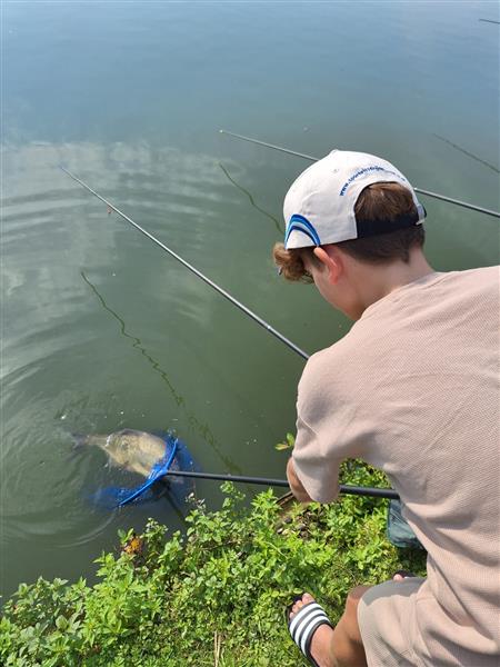 Zondag 1 september was de laatste dag van de viscursus 2024, een dag vissen bij HSV Haal Op. Dit jaar was het weer ons niet gegund, van de 5 lesavonden hadden we 4 met regen. Nu op de laatste dag 30 graden, geen wind en vol in de zon. Maar de kinderen vonden het prima. Er werd goed gevangen, zowel kleine als grote vissen. Ze hadden niet eens tijd om lang over een broodje frikandel met fris te doen. Snel terug naar de hengel en vis vangen. Om 14.00 uur gingen we stoppen en waren de kinderen voldaan van deze dag. Van de ouders kregen we zeer leuke reacties en er werd zelfs een klein bedrag gegeven voor sponsoring. Daarvoor alsnog bedankt.